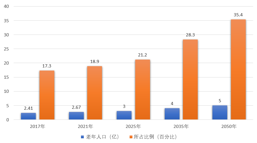 十四五末期,中國老齡人口將超過3億,2035年左右我國60歲及以上老年人口將突破4億,在2050年前后達到頂峰,約占總人口的1/3。那時,中國將有4.8億、甚至接近5億老年人,是世界上老年人口最多的國家。