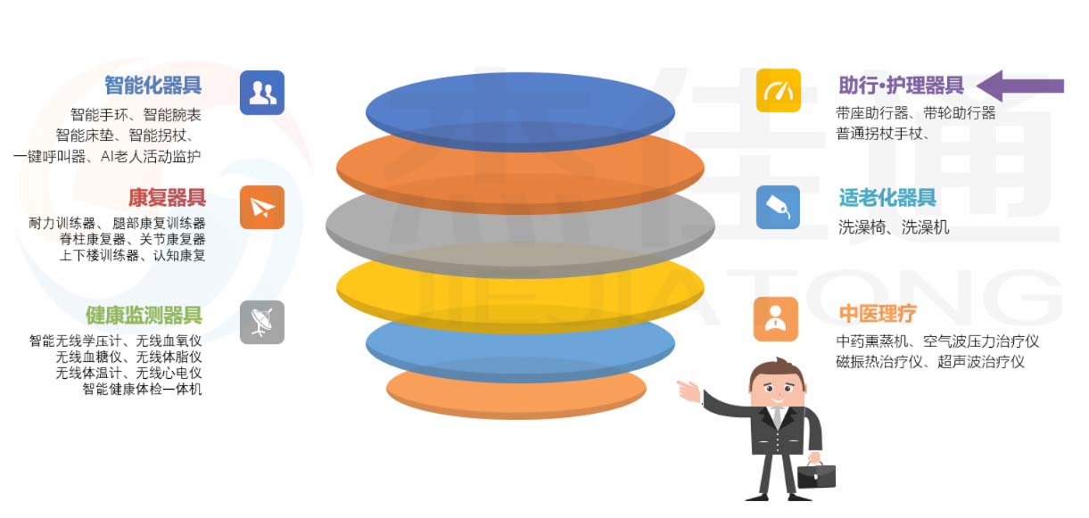通過有針對性地配備康復輔助器具、設備、儀器,對老年人缺失的生理功能進行補償、代償,改善和 提高老年人適應居家生活環境能力。主要類別包括: 助餐類:適老自助餐具、U 型杯等; 助行類:助行器、拐杖、輪椅等; 助穿類:穿襪器、穿鞋器等; 如廁類:坐便器、便盆、接尿器等; 洗浴類:助浴床等; 照護類:護理床、床邊桌、手動升降晾衣架等 扶手:各類助行和安全防護扶手等。