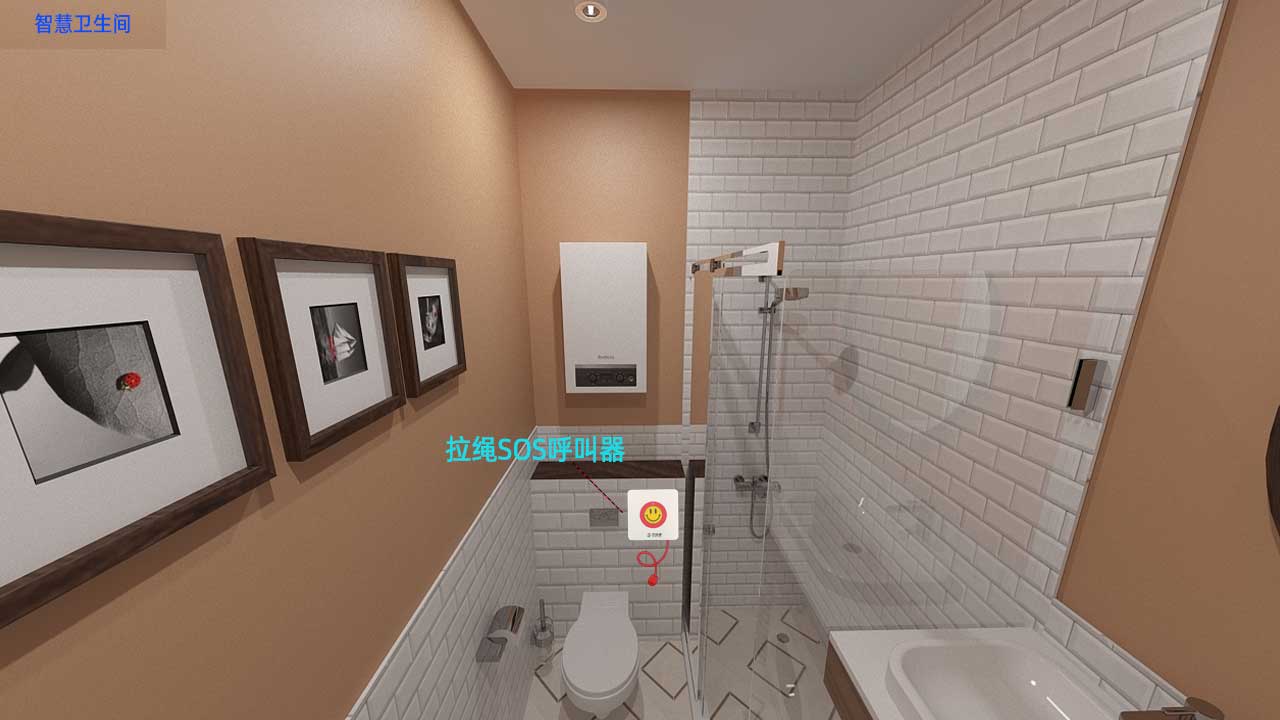 在衛生間安裝拉繩SOS呼叫器,當不舒適時,可以通過拉繩或者按下呼叫器按鈕,把求助信息發送到值班中心或者子女手機上。