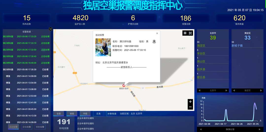 1、在茶幾上、過道、餐桌旁、廚房內粘貼SOS呼叫器或者拉繩SOS呼叫器按鈕。當老人出現異常時,老人隨手拍一下,即發出救助呼叫信息,智慧調度值班中心大屏上即時彈出老人的詳細信息;子女手機上也即時提示老人異常信息。